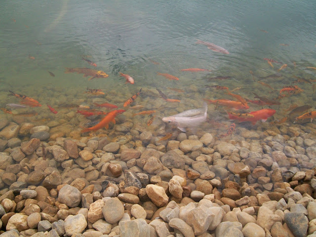 No lago central é possível observar os peixes KOI, e dragões esculpidos que se erguem da água.